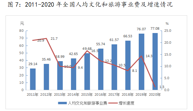 2020年,全国文化和旅游事业费1088.26亿元,比上年增加23.51亿元,增长2.1%;全国人均文化和旅游事业费77.08元,比上年增加1.01元,增长1.3%。