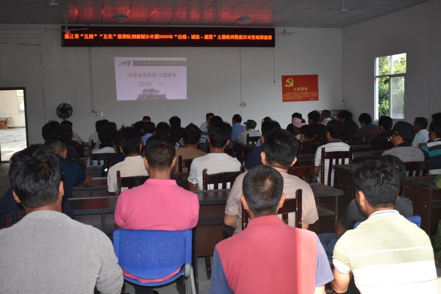 为深入贯彻落实中央、省委、州委、县委关于打赢脱贫攻坚战重大决策部署,4月20日,盈江县“五用”“五化”宣讲队到新城乡傣龙村开展2020年脱贫攻坚“自强诚信感恩”主题教育暨脱贫攻坚政策宣讲,本次宣讲由傣龙村驻村第一书记、县委党校讲师郭彩盛主讲、傣龙村村社干部、建档立卡户群众共78人参会。