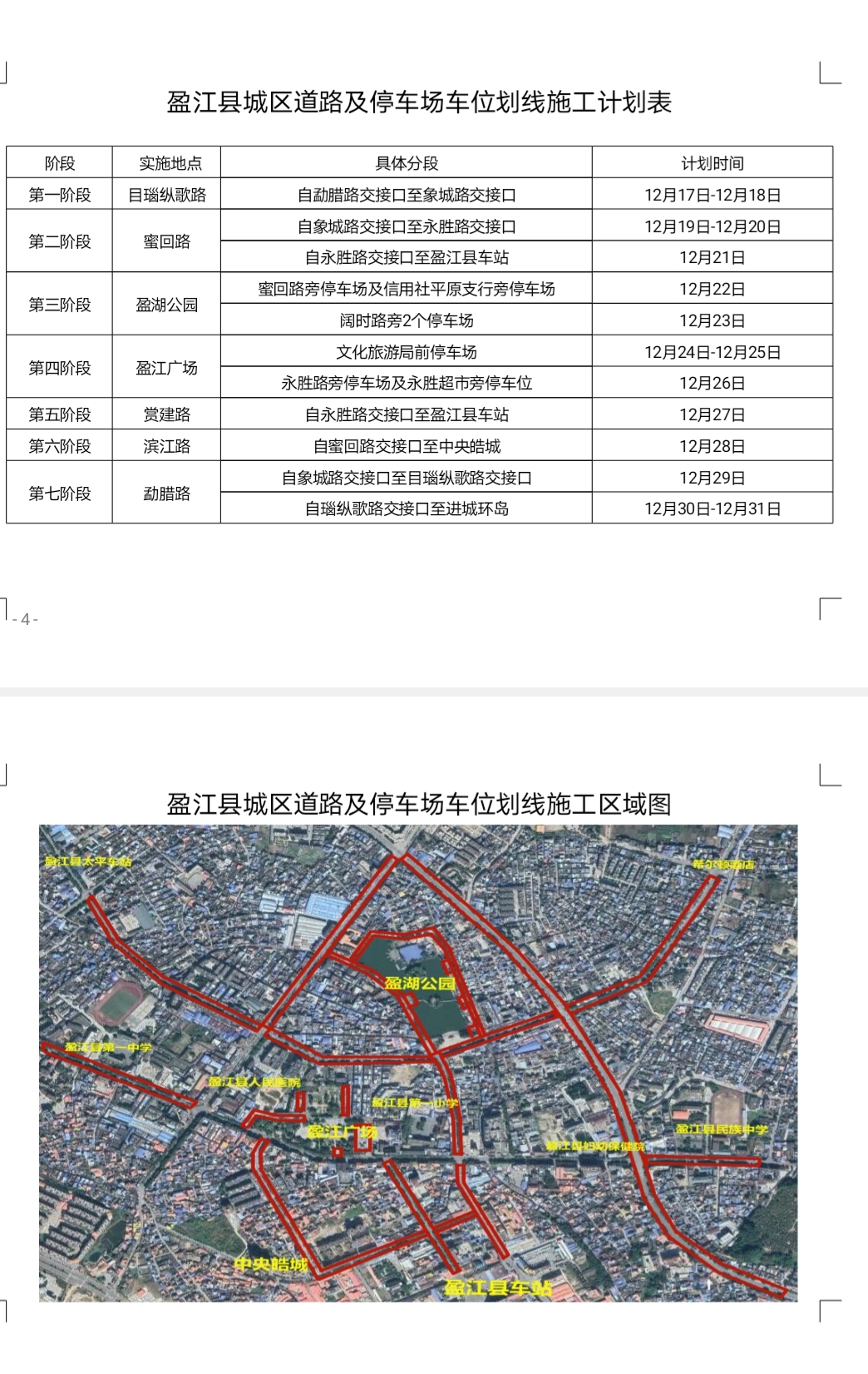 为了彻底改善我县停车难、停车乱的现状,优化停车环境,处理车位线不清晰、破损等问题,真正解决群众烦心事,提升城区交通管理水平和城市品位,根据《2020年盈江县第十七届人民政府第87次常务会议纪要(第15期)》精神,为能尽快完成县城区道路停车位线的施工任务,快速恢复县城区道路交通,经我局、县交警大队及县内停车服务管理的国有企业研究决定,自 2020年12月17日起将对盈江县城区道路及停车场进行停车位划线施工,为期14天,施工分为七个阶段进行(具体情况见附件1),工作时间为早上9点至晚上8点,此期间停车的居民请在施工划线前将车辆驶离施工区域,未能驶离且无法联系的车辆将被县交警大队移至他处,由此产生的费用由车主自理。