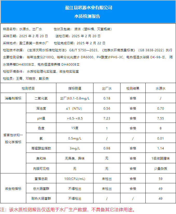 2025年2月20日盈江县第二自来水厂《水质检测报告》