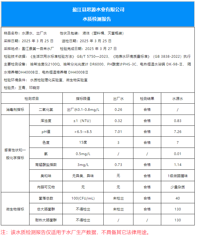 2025年3月25日盈江县第一自来水厂《水质检测报告》