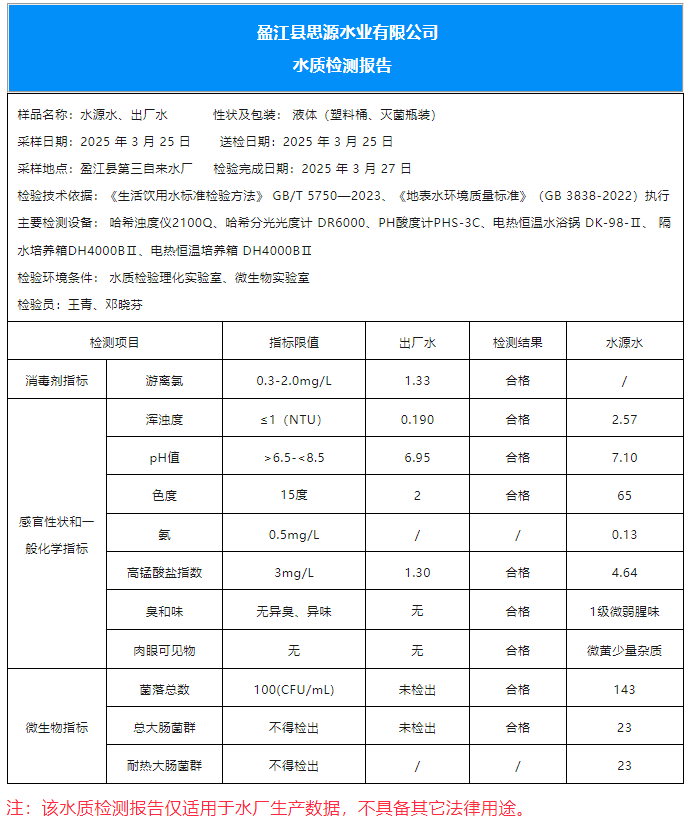 2025年3月25日盈江县第三自来水厂《水质检测报告》