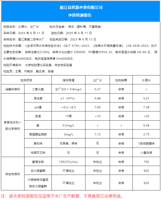 2025年6月11日盈江县第二自来水厂《水质检测报告》