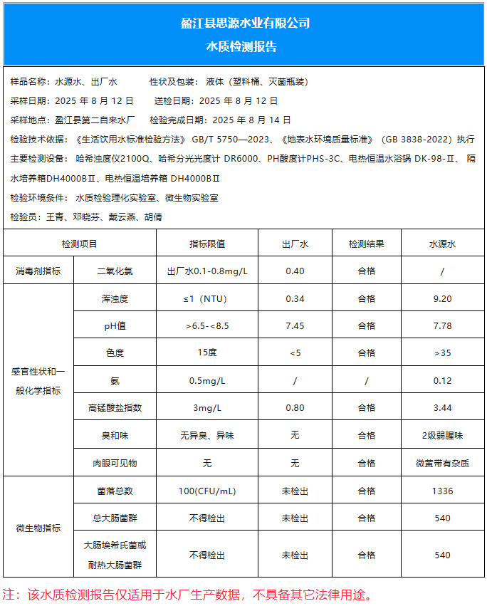 2025年8月12日盈江县第二自来水厂《水质检测报告》