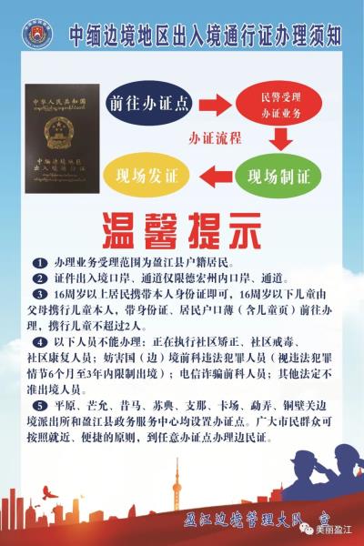2023年1月8日,国家移民管理局恢复签发边境地区出入境通行证(简称“边民证”)。为更好地做好群众服务工作,盈江边境管理大队在平原、芒允、勐弄、昔马、支那、卡场、苏典、铜壁关8个边境派出所和盈江县政务服务中心各设1个边民证办证点。盈江县户籍居民可根据出行计划按照就近、便捷的原则到任意办证点办理边民证。